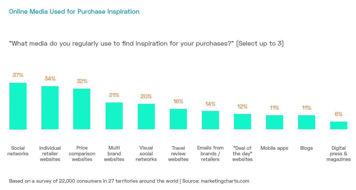 Traditional customer service departments, with their IVR telephone systems, requesting that customers ‘press one for billing and payments’ simply don’t cut it in the digital world. Customer now expect the brands they love to not only have a more personal relationship with them, but to reach out to them, proactively, in the way they’re most comfortable with and via the channels they are already using. This is even more important when you consider that the channels they are already using are increasingly where purchase decisions are made. According to a Global Consumer Insights Survey from PwC, social networks are now the online media most used for purchase inspiration, ahead of individual retailer websites and independent price comparison websites.