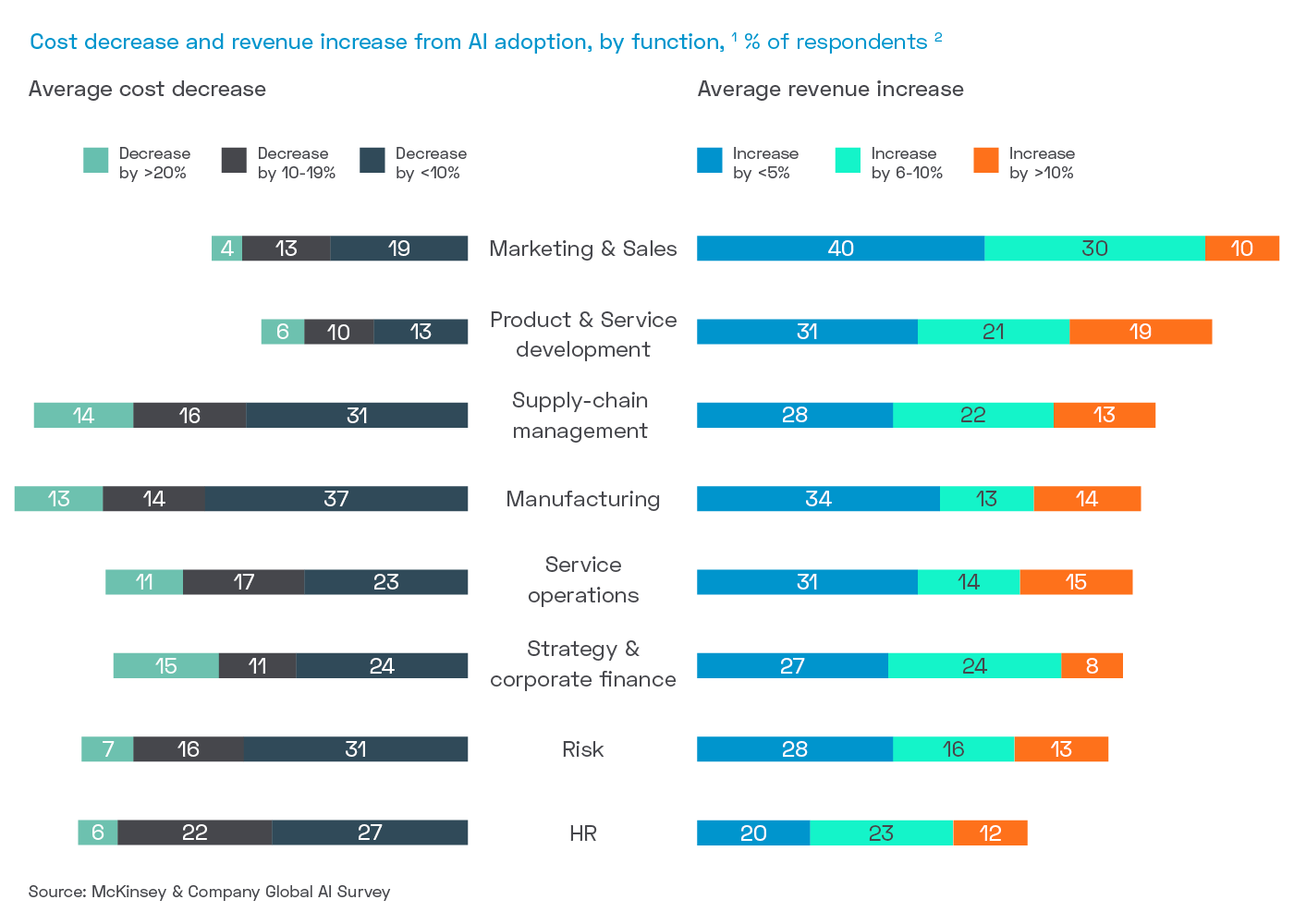 The findings of the latest McKinsey Global AI Survey indicate an increase of nearly 25% year-on-year in the use of AI in standard business processes, with a significant number of companies now using AI in some form across multiple areas of their business. It’s working for them, and not just in terms of more engaged or satisfied customers. The data clearly shows a strong correlation between the adoption of AI and an increase in marketing and sales revenue.