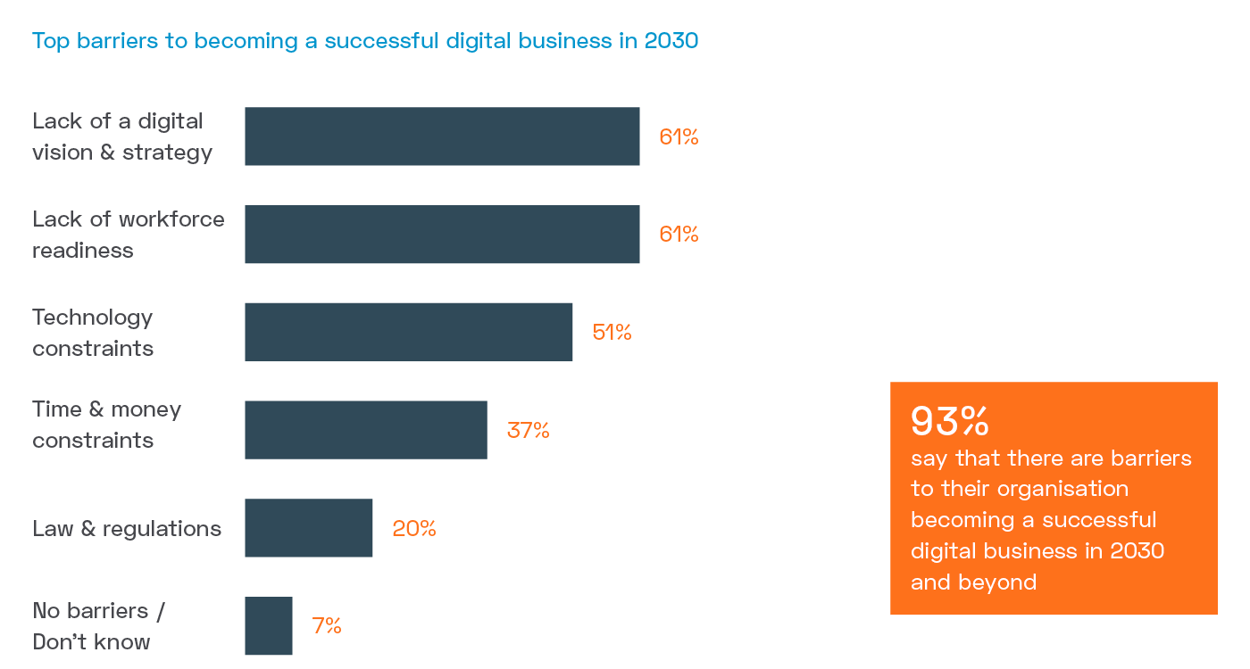 In spite of recent advances in smart technology, research by Dell Technologies found that 93% of survey respondents reported they feel there are barriers that will prevent them becoming a successful digital business in 2030 and beyond. Over 50% state that technology restraints will stand in their way, and over 60% said they lack a digital vision and strategy to take them forward.